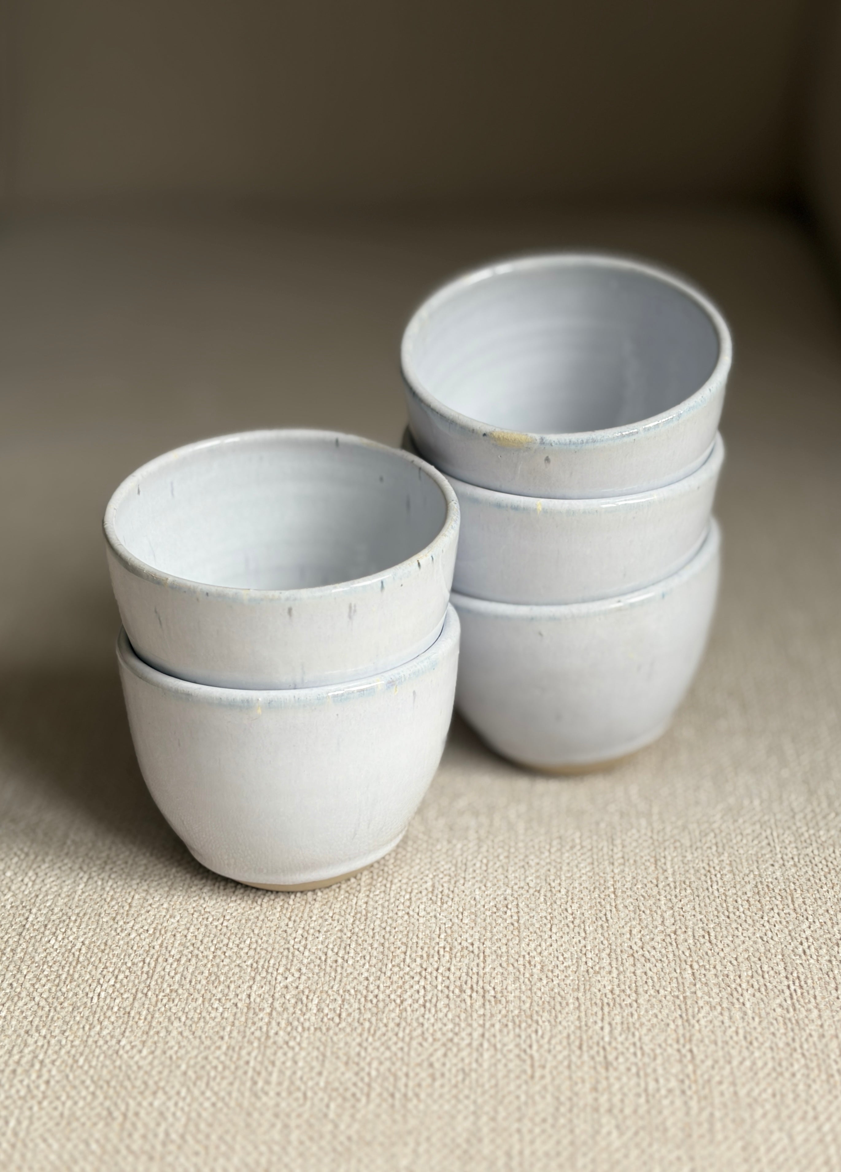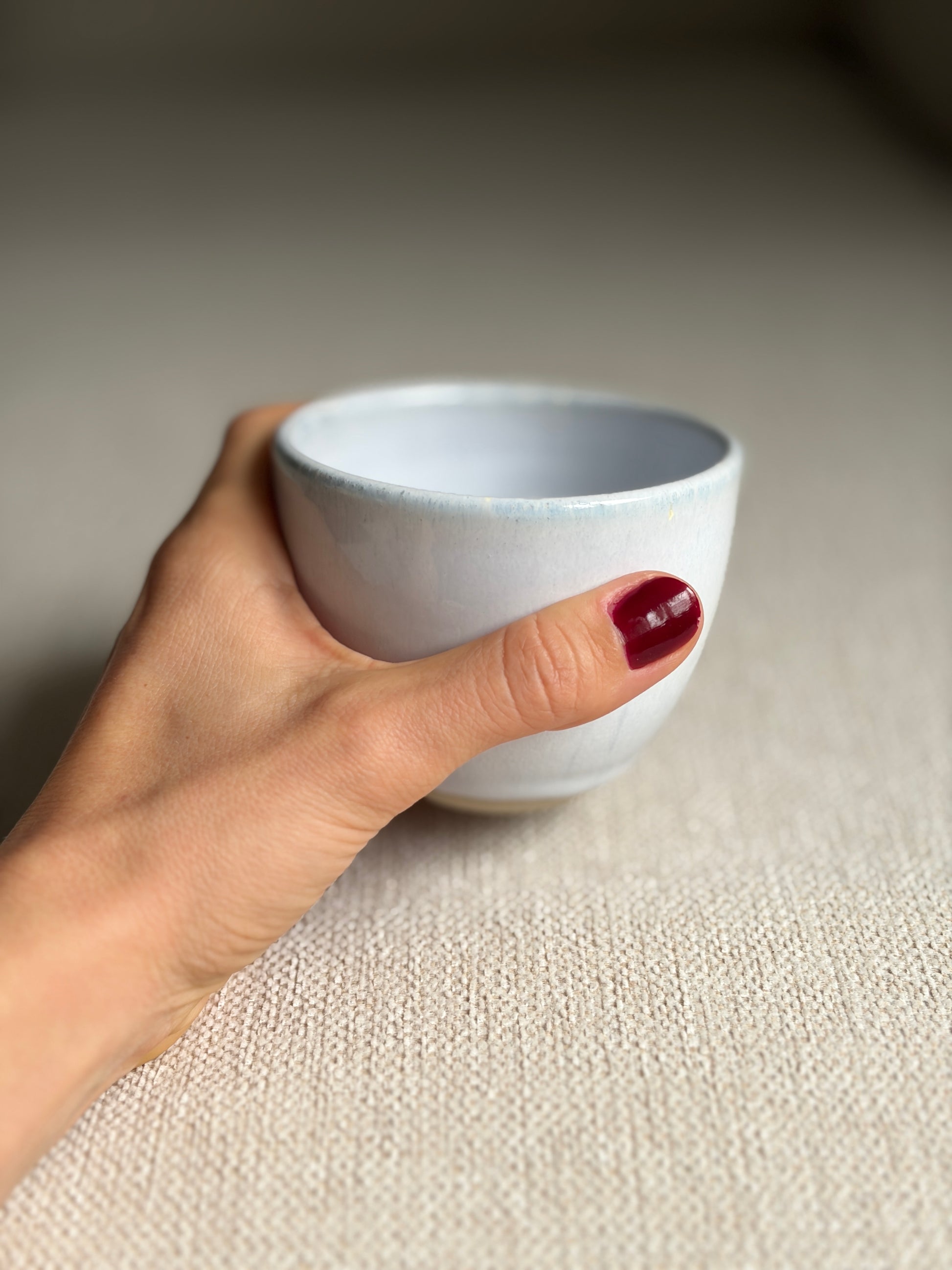Aus dem kleinen, eisblauen Kaffeebecher ohne Henkel schmeckt dein Kaffee, Tee oder Matcha besonders gut – die kompakte Größe liegt dabei angenehm in der Hand. Der Becher kann aber noch mehr: Er funktioniert ebenso als charmante Mini-Vase oder kleiner Blumentopf.