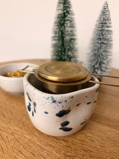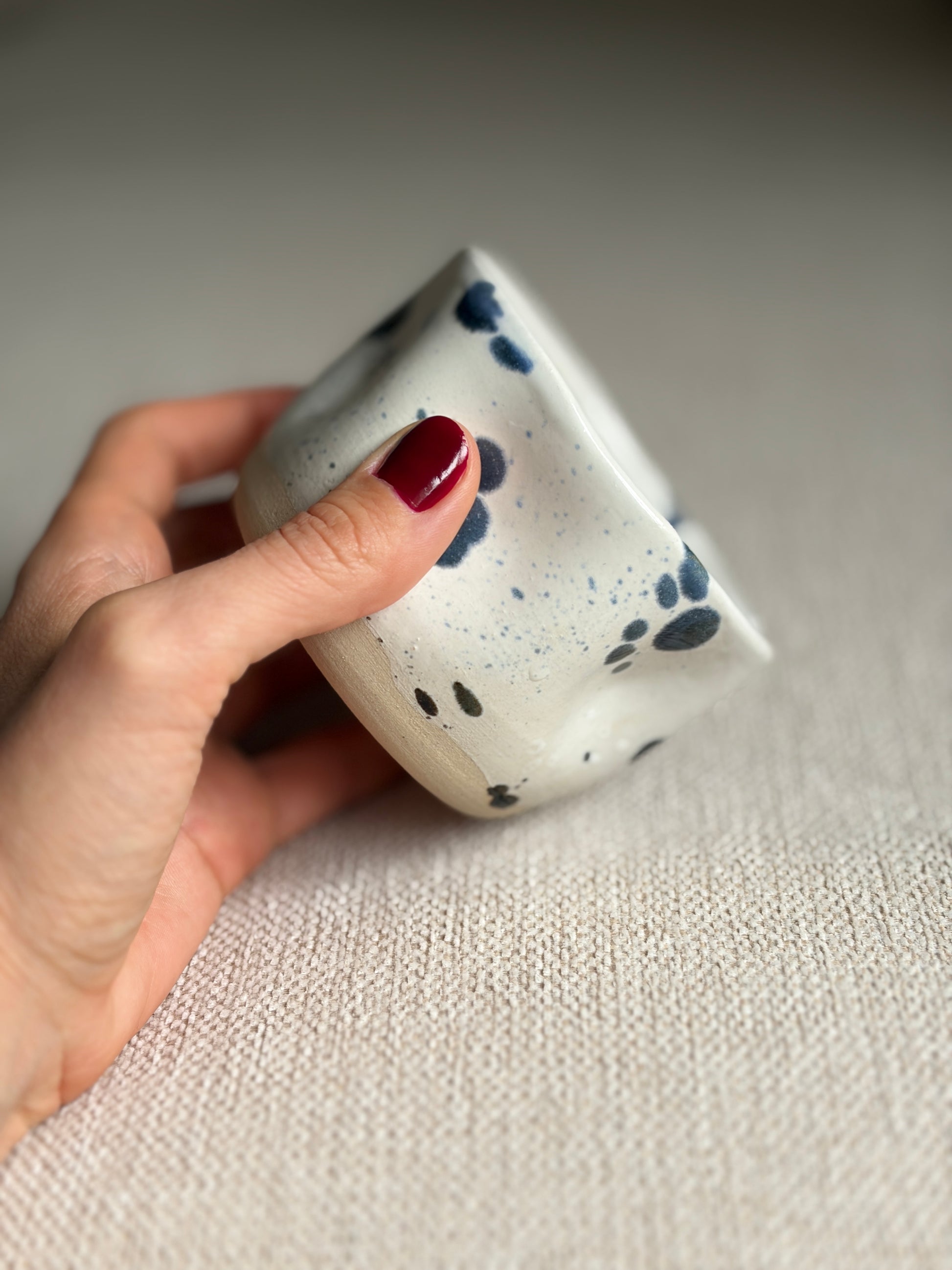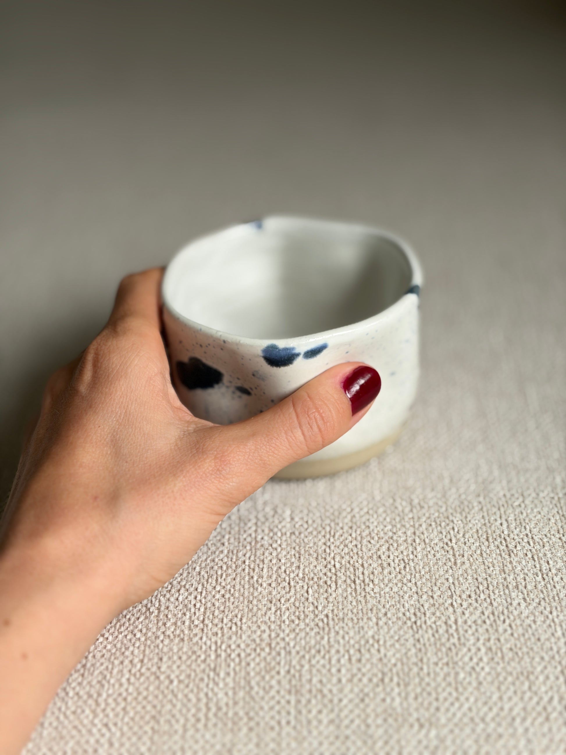 Dieser charmante, organisch geformte Becher in weiß mit dunkelblauen Sprenkeln besticht durch sein individuelles Design. Er liegt angenehm in der Hand und verleiht jedem Getränk einen besonderen Touch.