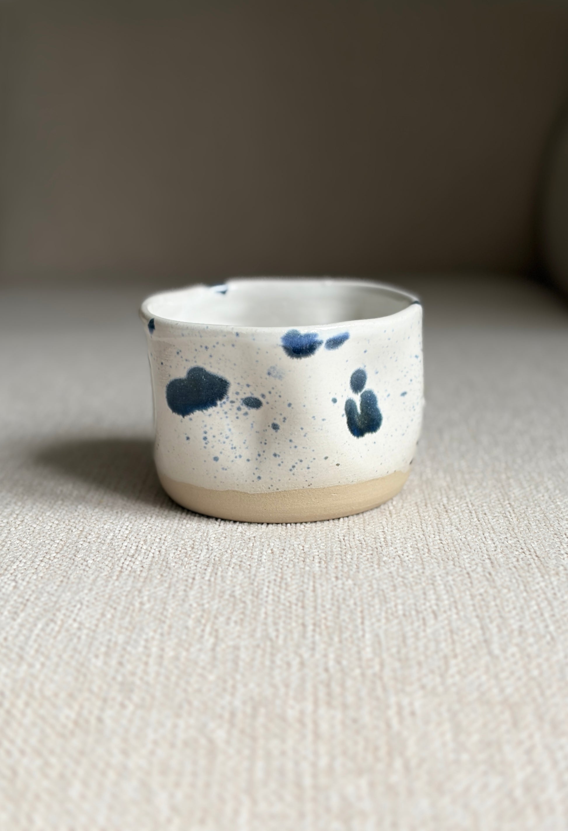 Dieser charmante, organisch geformte Becher in weiß mit dunkelblauen Sprenkeln besticht du...