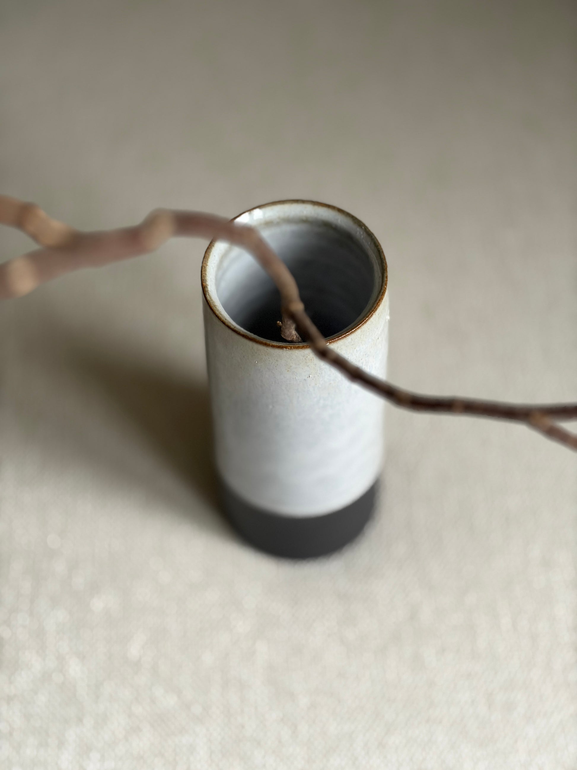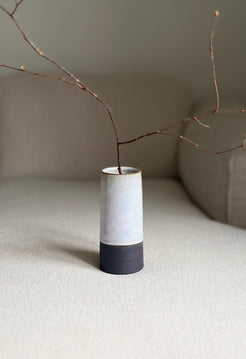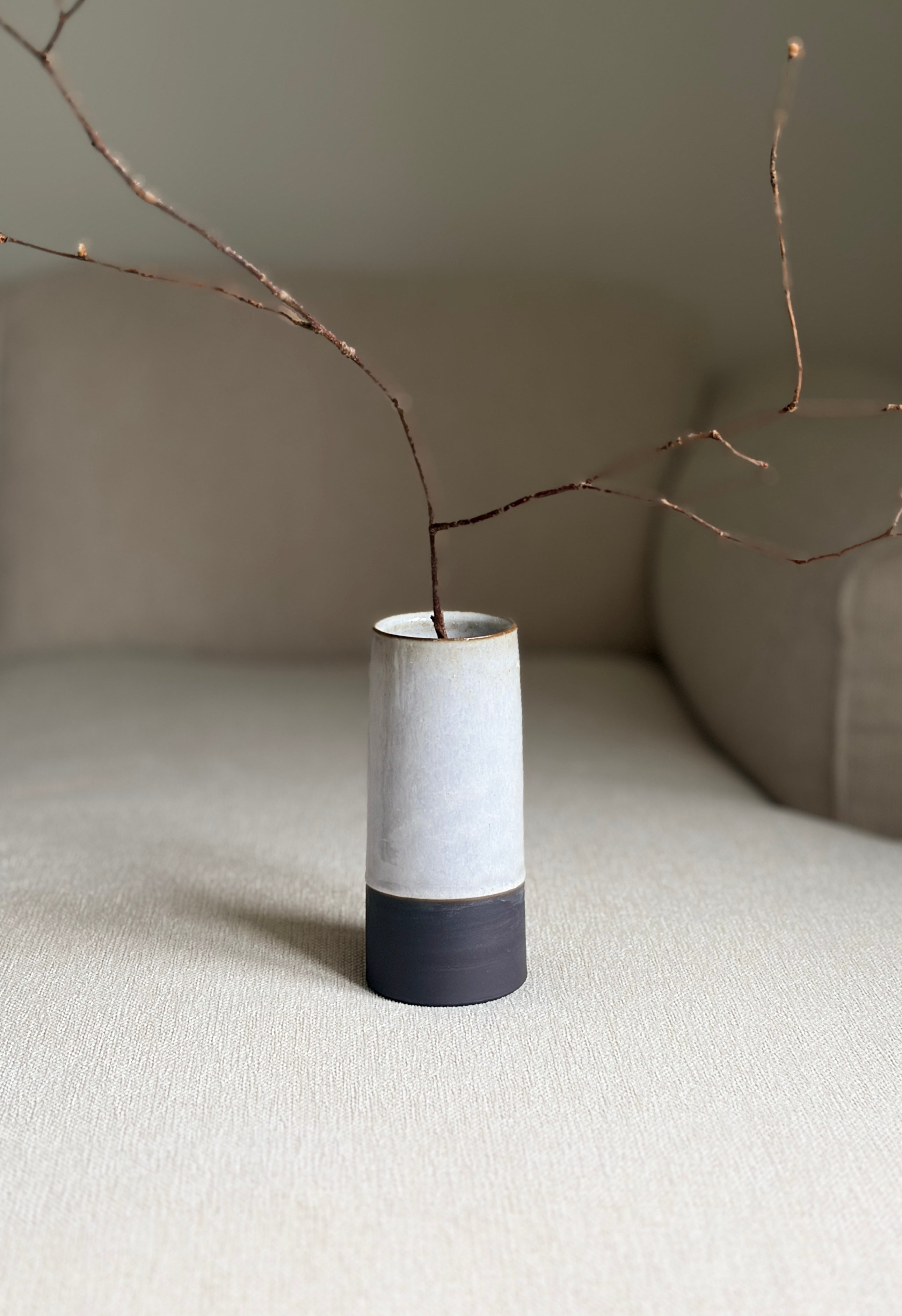 Die Vase aus schwarzem Ton mit eisblauer Glasur, mit ihrer geraden, schlichten Form, eignet sich ideal für einzelne langstielige Blumen, Zweige oder puristische Arrangements. Ein besonderes Gestaltungselement: Der untere, unglasierte Rand hebt sich optisch ab und verleiht der Vase ihren handgemachten Charakter.
